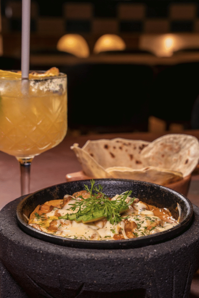 Queso derretido servido en cazuela caliente, con chorizo artesanal y tortillas para acompañar.